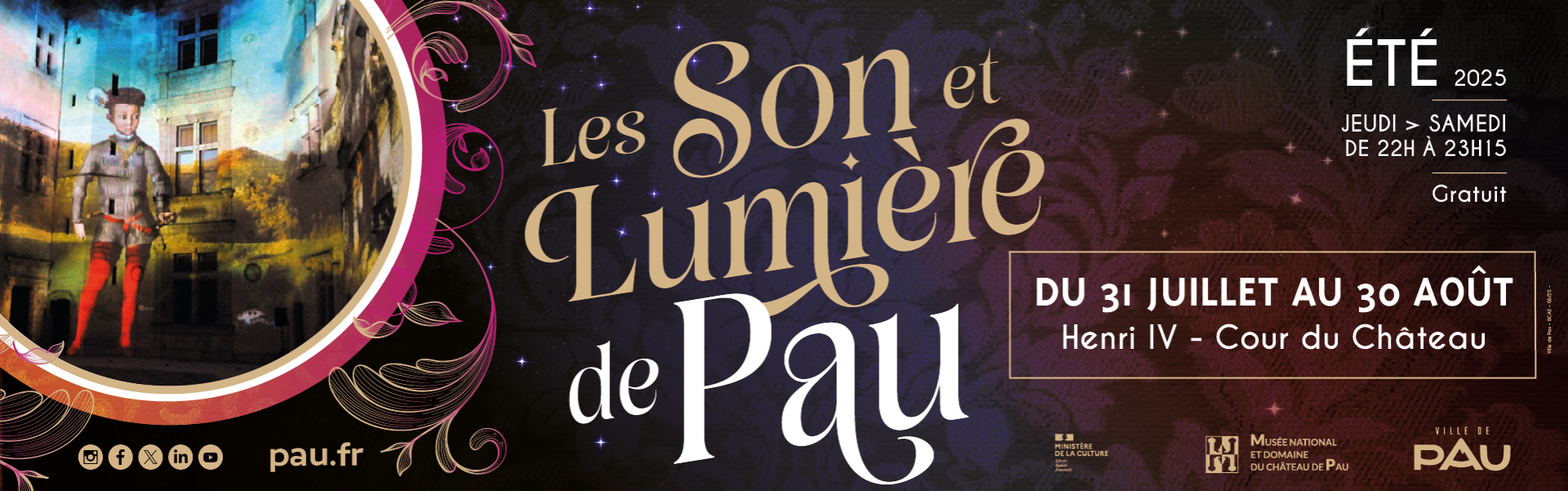 Le spectacle son et lumière projeté sur les murs de la cour d’honneur offre une occasion unique de redécouvrir un récit visuel et poétique, spécialement conçu pour le château de Pau. À travers une mise en scène monumentale, les spectateurs sont invités à revivre les moments phares de la vie d’Henri IV, depuis sa naissance au château le 13 décembre 1553, jusqu’à son assassinat tragique le 14 mai 1610. Un hommage vibrant à l’enfant du Béarn devenu roi de France, dans un cadre majestueux à la tombée de la nuit.