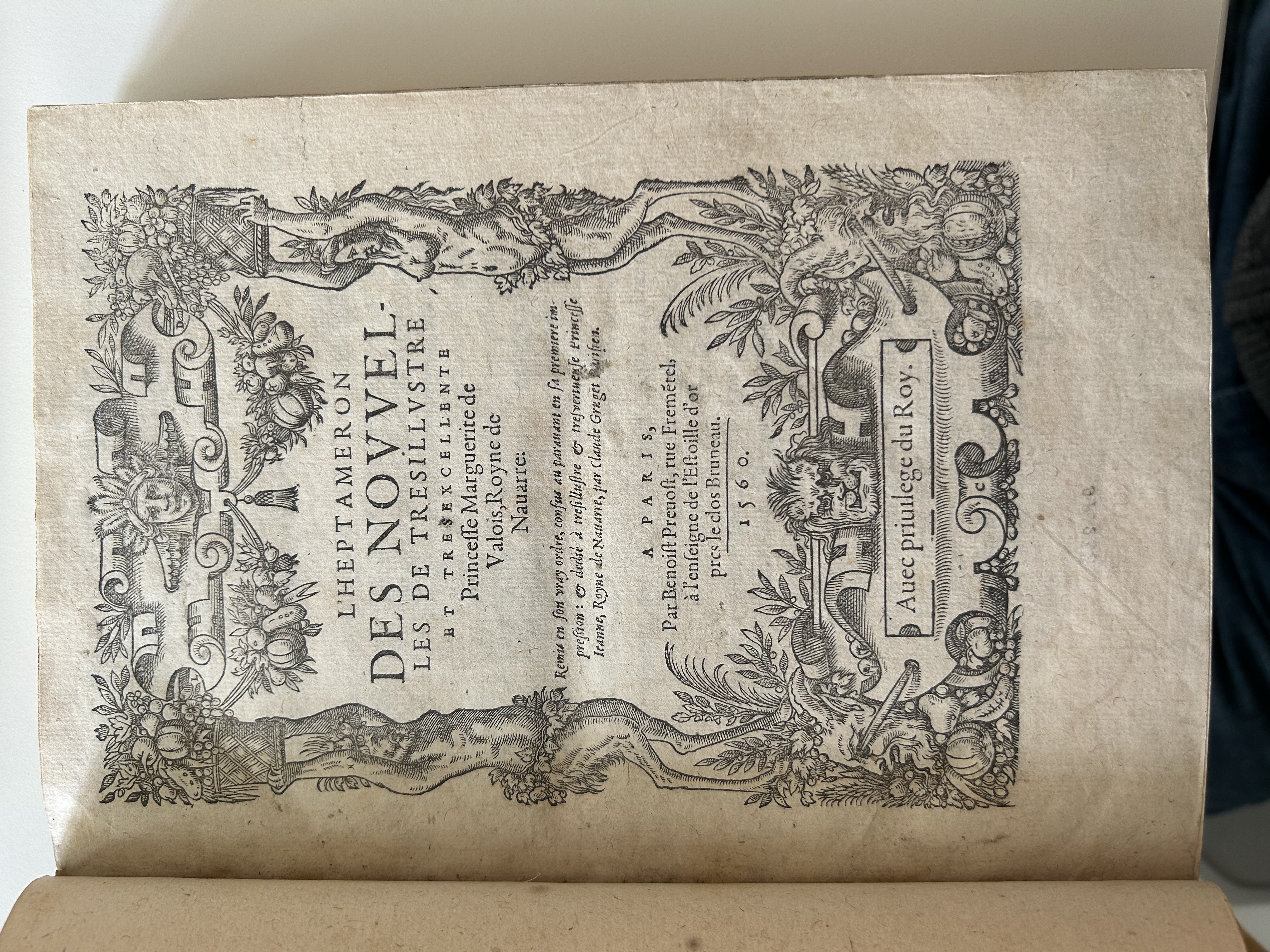 Pour cette première rencontre avec le grand public, nous avons choisi de sortir des collections un de nos trésors : L’Heptaméron de Marguerite de Navarre. Nous possédons une des premières éditions de ce texte majeur, publié à Paris, en 1560, par Benoît Prévost.